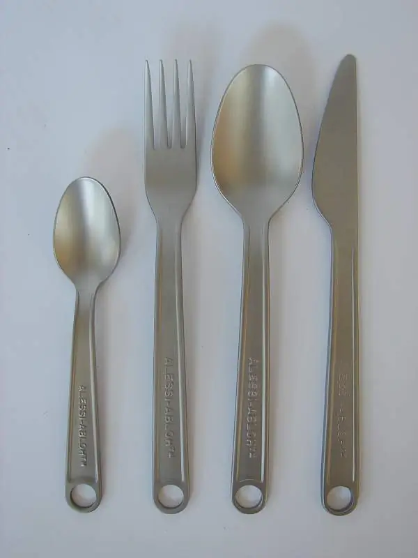 Besteck aus Edelstahl 18/10, matt. In Industriedesign mit der Anmutung von Werkzeug. Praktische Aufbewahrung an einem Halter, der einer Gewindestange gleicht. Auf der Unterseite des Ständers befindet sich das Logo der Alessi-Abloh-Kooperation.