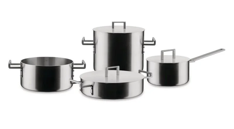 Set aus Topf, zwei Kasserollen und einer Stielkasserolle, Design von David Chipperfield unter Mitwirkung von Sternekoch Pietro Leemann.