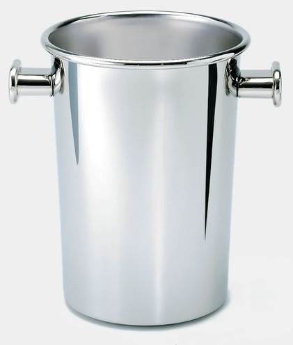 Weinkühler mit Griffen aus Edelstahl für zwei Rheinweinflaschen oder eine Magnum aus Edelstahl 18/10, glänzend polierte Aussenseite, mattierte Innenseite. Dieser Weinkühler ist speziell dafür konzipiert, drei von fünf möglichen Weinflaschenformen bis zum Hals zu kühlen. Das besondere Augenmerk galt dabei den funktionellen Details: Der Körper ist am Boden stärker, um mögliche Dellen zu vermeiden. Die Griffe bieten einen festen Halt, auch wenn nur mit einer Hand zugegriffen wird, der Kühler fasst zwei Flaschen und ist so hoch, dass die Flaschen in ganzer Länge eingetaucht werden können. Dank der günstigen Form können mehrere Weinkühler übereinander gestapelt werden. ArtNr. 5052/RM , Design Sottsass Ettore , Inhalt 650 cl, Durchmesser: 21cm , 27cm hoch