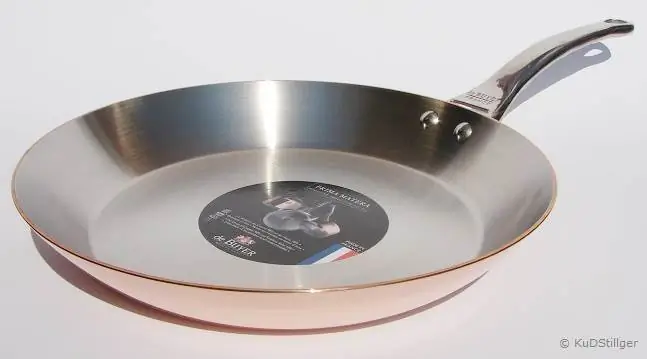 inocuivre - echtes Kupfer für Induktion, Wandstärke 2 mm, innen mit einer dünnen Schicht aus Edelstahl gemantelt, dadurch leicht zu reinigen. Somit ist ein robuster Schutz des Korpus gewährleistet. Auf dem Bild kann man sehr gut die dicke Kupferschicht erkennen.