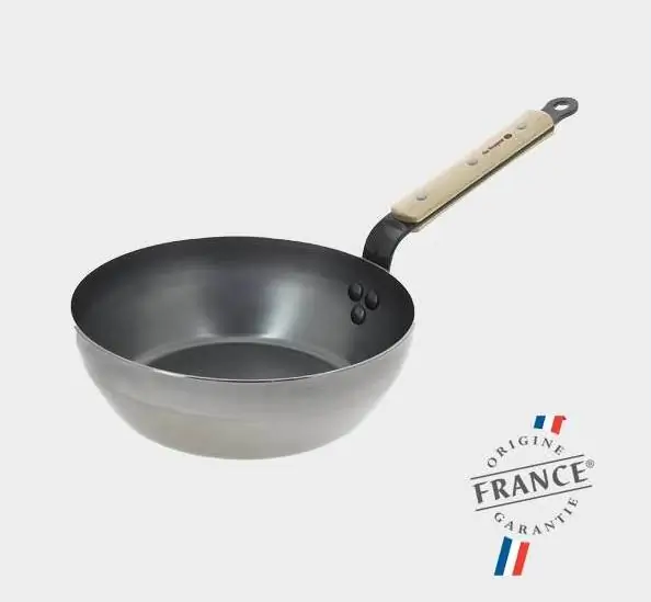 Eisenpfannen sind für alle Herdarten geeignet, auch für Induktionsherde. Der Griff aus Eisen liegt zwischen zwei Griffschalen aus Buchenholz aus den Vogesen.