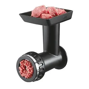 Zwei Lochscheiben (grob und fein) zur Verarbeitung von Fleisch, Fisch und Gemüse enthalten, ebenso ein Wurstfülltrichter und ein Spritzgebäckvorsatz mit 5 Motiven.