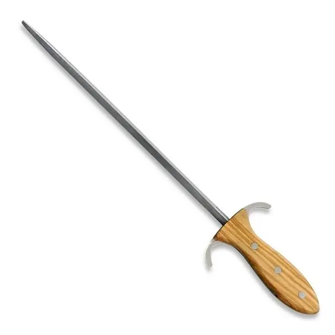 32 cm lange Klinge, Olivenholzgriff mit ausziehbarem Haken zum Aufhängen. Breiter Fingerschutz.