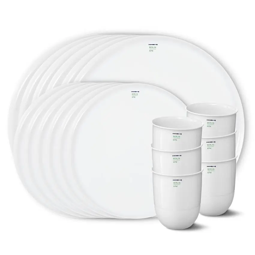 Der Set besteht aus 6 Tellern 19 cm, 6 Tellern 26 cm und 6 Bechern der Grösse No. 1 - Inhalt 0,18 ltr, 8,8 cm hoch.