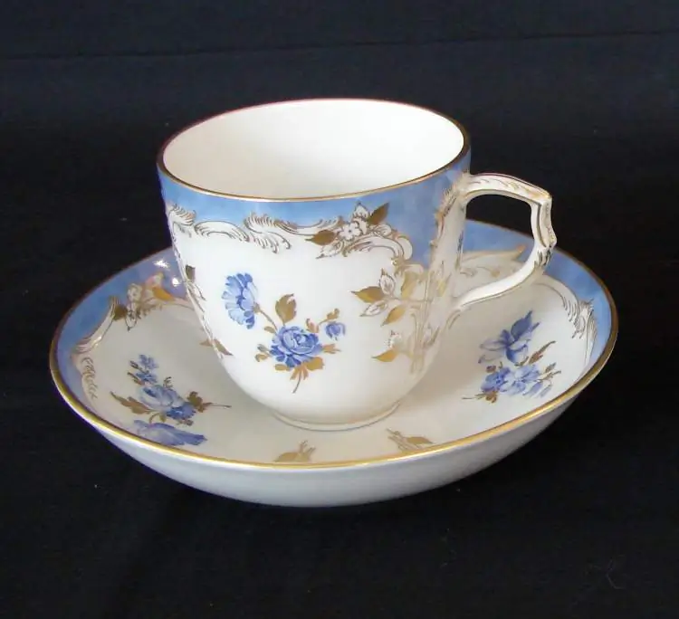 Dekor 56 - reine Handmalerei, wobei die flächigen Farben in mühevoller stundenlanger Arbeit frei von Schattierungen gestupft werden müssen. Letzter Farbentwurf für Friedrich den Großen, der über Monate der Versuche nicht mit dem mouranten Bleu (sterbendes Blau) zufrieden zu stellen war. Den Malern wurde deshalb blümerant.