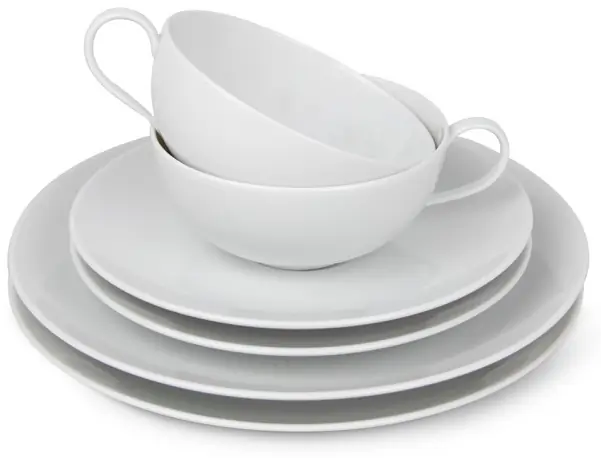 Set bestehend aus 2 Tee-Ober- und 2 Tee-Untertassen und 2 Frühstückstellern 19,5 cm, weiss.
