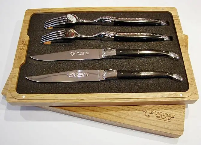Set bestehend aus 2 Steakmessern in feinster geschmiedeter Qualität mit Ebenholzgriffen und 2 entsprechenden Gabeln aus der berühmten Manufaktur Laguiole en Aubrac. Klinge aus sehr hochwertigem schwedischen Sandvik-Stahl 12C27.