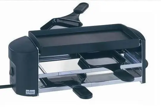 Das Raclette- und Grillgerät für den Single- und Kleinhaushalt für 2 Personen: - mit antihaftbeschichteter Grillplatte, platzsparend auf dem Tisch und im Schrank, mit Parkdeck, 2 beschichteten Raclettepfännchen und 2 Kunststoffspachteln. Design: Kurt Zimmerli. Technische Daten: 230 Volt, 450 Watt. Abmessungen: 34.5 x 11 x 9.5 cm.