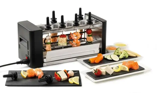 Garnelen- oder Gemüsestückchen, Fisch, Obst usw. einfach auf die gezackten Spieße stecken und in die Halterung einhängen.