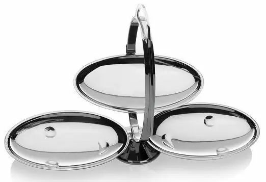 Die kleine Skulptur zeigt das berühmte ikonische Gesicht aus der Feder Mendinis in Form einer mehrstufigen Etagere. Anna Gong verwandelt sich in eine Etagere in dem der Teil des Haarschopfs angehoben wird. Dieser blockiert die Drehfunktion, die die drei Ebenen nacheinander aufklappen lässt. Faltbare Etagere aus Edelstahl 18/10 mit Dekor cm 44x20 - h cm 27