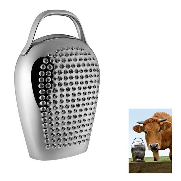 Die von Lorenza Bozzoli und Gabriele Chiave entworfene Käsereibe Cheese please in Form einer Kuhglocke kommt einem Wortspiel gleich. Die Form – ebenso attraktiv wie sinnstiftend – offenbart sich gleichzeitig als besonders angemessen für die Funktion dieses Haushaltsgegenstands. Bei der Entwicklung der Reibe wurde ein besonderes Augenmerk auf die Form und Anordnung der Löcher gelegt. Letztlich entschied man sich für runde, gezahnte Löcher. So lässt sich der Käse einfach und -in einem Zug- reiben, was besonders für reifen Hartkäse wie Parmesan oder Pecorino empfohlen wird. Käsereibe aus Edelstahl, Höhe ca. 17 cm.