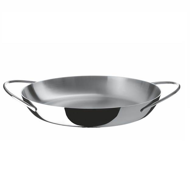 Die Töpfe bestehen aus einem dreischichtigen Material (Edelstahl/Aluminium/Edelstahl), um eine optimale Wärmeverteilung zu gewährleisten. Für alle Herdarten inclusive Induktion geeignet. Design Elisa Giovannoni, 2012. Flache Kasserolle mit zwei Griffen aus Multiply (AISI 430, Aluminium, Edelstahl 18/10). 420 cl - Ø 34 cm - 7 cm hoch.