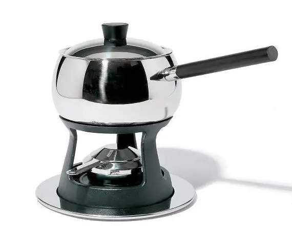Bourguignonneset bestehend aus: Topf aus Edelstahl 18/10 mit wärmestrahlendem Edelstahlboden und Griff aus schwarzem Holz. Rechaud aus Gußeisen. Brenner (für Sicherheits-Brennpaste) und Unterteller aus Edelstahl 18/10. ArtNr. SG55/200 B Designer Giovannoni Stefano Dm Topf ca. 19 cm ohne Griff. Gesamthöhe ca. 24 cm.