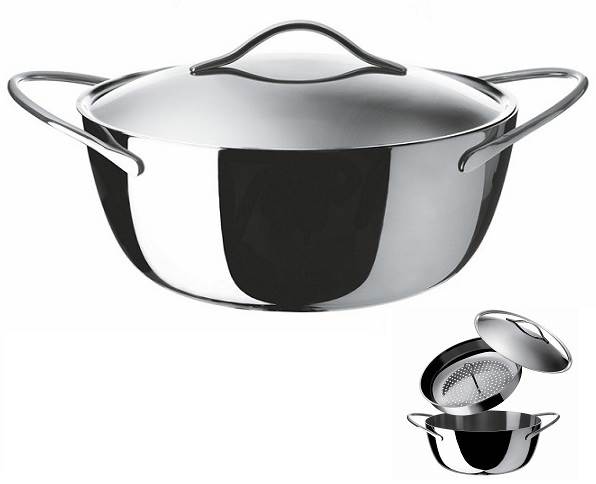 Das von Elisa Giovannoni gestaltete Topfset Domenica umfasst wenige essentielle und vielseitig einsetzbare Objekte wie eine flache Kasserolle, eine höhere Kasserolle, einen Korbeinsatz zum Dünsten und einen Wok. Alle verfügen über ein großes Fassungsvermögen und breite Henkel, um den verschiedensten Anforderungen beim Kochen zu entsprechen und die Gerichte in den Momenten größter Geselligkeit direkt am Tisch zu servieren. Die Töpfe bestehen aus einem dreischichtigen Material (Edelstahl/Aluminium/Edelstahl), um eine optimale Wärmeverteilung zu gewährleisten. Für alle Herdarten inclusive Induktion geeignet. Design Elisa Giovannoni, 2012. Kasserolle mit zwei Griffen aus Multiply (AISI 430, Aluminium, Edelstahl 18/10) mit Dunstkocheinsatz und Deckel aus Edelstahl 18/10. 470cl, - Ø 26 cm - 12,8 cm hoch.