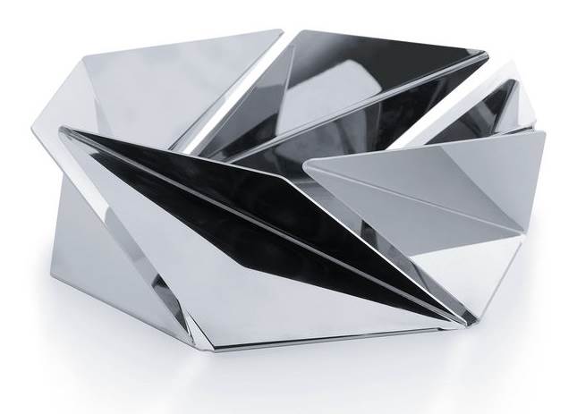 Design Naoko Shintani 2015. Inspiriert von der japanischen Origami-Tradition sollte die Bewegung von gefaltetem Papier auf Metall übertragen werden. Das fertige Objekt erinnert an ein Kaleidoskop, das seinen Inhalt in einem unendlichen Spiel der Querverweise widerspiegelt und vervielfältigt. Dank seiner kompakten Größe ist Kaleidos als Korb, Obstkorb oder einfach als Ablage gedacht. Korb aus poliertem Edelstahl. Durchmesser 26 cm, 9 cm hoch.