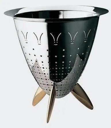 Sieb aus Edelstahl 18/10, glänzend polierte Außenseite, mattierte Innenseite. Füße aus Gussmessing. Die Projekte, die Philippe Starck für Alessi entwickelt hat, haben sich nach und nach im Bereich der heimischen vier Wänden als Persönlichkeiten mit Gestalt und Namen etabliert. Das Gemüsesieb Max le chinois ist ein ironisches Objekt, das sich in die Rituale der Küche einfügt. Es ist schön, es ist groß und aufgrund seiner Ästhetik teuer, aber sein auffälliges Design hebt es aus der Masse der anderen Siebe heraus, wird aber gerne auch für andere Zwecke verwendet. ArtNr. 90025, Design Starck Philippe, Durchmesser: 30 cm, 29cm hoch