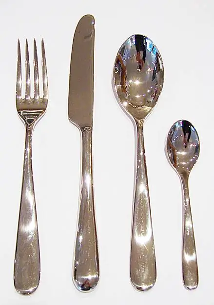Gabel, Löffel, Kaffeelöffel und Messer aus Edelstahl 18/10 in der üblichen Menugrösse. Keine Naht am Messer zwischen Griff und Klinge.