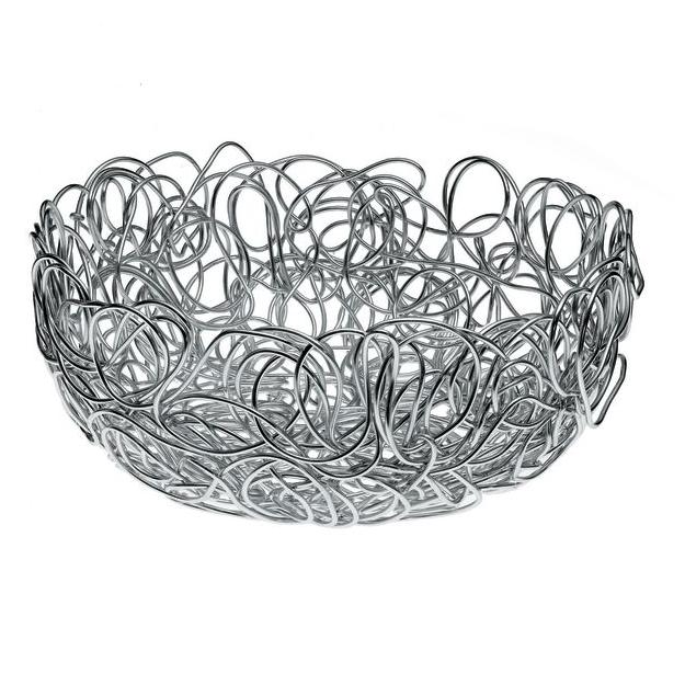 Korb, rund aus eloxiertem Aluminium. Nuvem bedeutet im Portugiesischen Wolke und spielt damit auf das Aluminiumdrahtknäuel hin, das verwickelt, anschließend gepresst und in Trichterform gebracht, das Ausgangsmaterial für die Objekte dieser Serie darstellt. Es war nicht leicht, eine Produktionsmethode zu finden, mit der es möglich war, das typisch handwerkliche und ungleichmäßige Flair dieses Grundgedankens der Brüder Campana zu bewahren und gleichzeitig eine Produktion zu erschwinglichen Preisen aufzunehmen. Das Ergebnis ist ein Beispiel dessen, was wir Lightness and Consistency nennen, Werte, die das Werk der genialen Brasilianer auszeichnen.