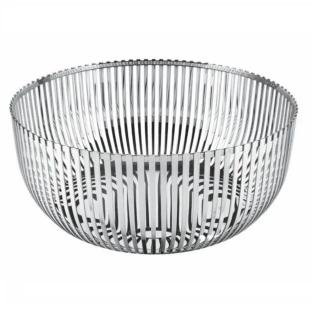 94 glänzende Stahlstäbe für unerwartete Lichtspiele. Obstschale aus Edelstahl 18/10 glänzend poliert. Die Obstschale, entworfen von Pierre Charpin, ist wegen ihrer offensichtlichen Funktion ein wichtiges Objekt in unserer häuslichen Landschaft in der Küche und im Wohnzimmer und sie strahlt eine Präsenz aus, die an vorindustrielle Zeiten und die alten Galerietabletts des 18. und 19. Jahrhunderts erinnert. ArtNr. PCH05/24 , Durchmesser: 24 cm, 11cm hoch.