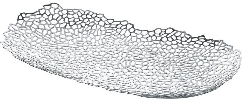 Der elegante Tafelaufsatz Opus wirkt durch seine Perforierung wie filigrane Spitze aus Metall. Design Guido Venturini. Diese Schale ist vor allem ein besonders schönes Stück als Deko für grosse lange Tafeln. Die Maße sind beachtlich: 60 cm lang, 34 cm breit und 7,5 cm hoch.