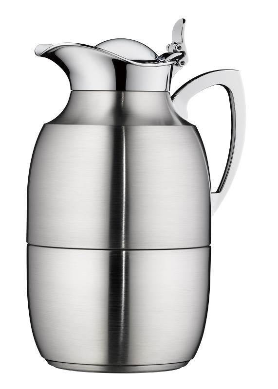 Urform aus dem Jahre 1918. alfiDur Glaseinsatz. Hält bis zu 12 Stunden heiss und bis zu 24 Stunden kalt. AromaSafe für den perfekten Geschmack. Die komplette Warmhaltekanne enthält keinerlei Schadstoffe. Ausführung in mattem Edelstahl.
