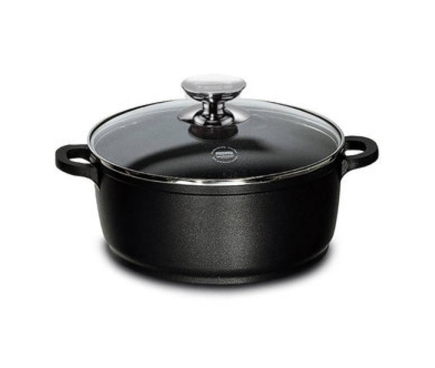 Bruchresistenter Glasdeckel mit Edelstahlknauf, angegossene Griffe, alles absolut backofengeeignet.