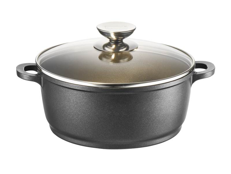 Bruchresistenter Glasdeckel mit Edelstahlknauf, angegossene Griffe, alles absolut backofengeeignet.