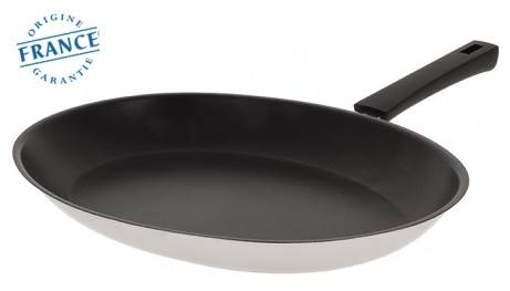 ovale Fischpfanne mit der bewährten PFOA-freien EXCALIBUR-Beschichtung. Edelstahlkörper poliert. Boden aus Mehrschichtmaterial mit idealer Hitzeverteilung - für alle Herdarten, auch Induktion geeignet. Fester schwarzer Griff, Backofenfest. Die Maße oben 36 * 28,5 cm, unten (Boden) 26,5 * 18,5 cm. Breite mit Griff 45 cm. Ø 35.0 cm, 4.3 cm hoch