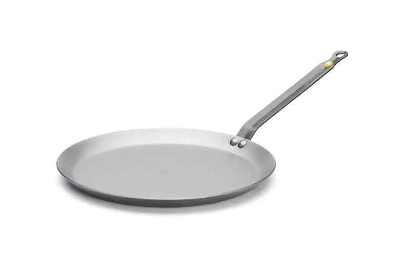Crepespfanne mit ca. 1,9 cm hohem schmalen Rand. Pfanne in schwerer Eisenqualität mit Bienenwachsversiegelung.