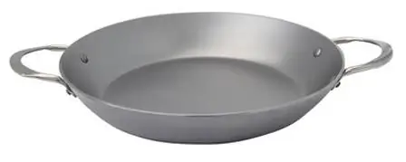 Paella-Pfanne in schwerer Eisenqualität mit Bienenwachsversiegelung, Ø Boden 24cm, Durchmesser komplett 43 cm, Durchmesser Oberkante 32 cm. Griffe aus Edelstahl. Backofen-geeignet.