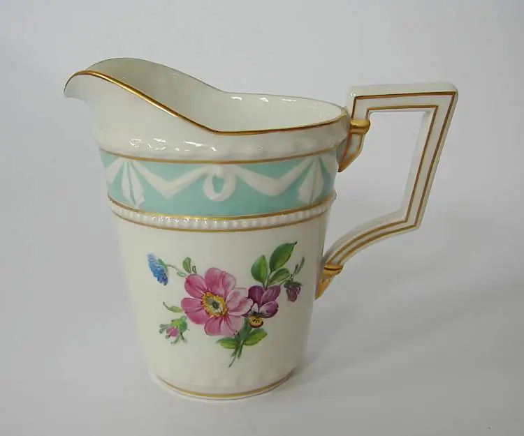 Die Serie Kurland hat Ihren Ursprung um 1790. Entworfen für den Herzog von Kurland war dies eine der allerersten klassizistischen Porzellanformen (aus dieser Zeit stammt auch das Service Perl der Nymphenburger Manufaktur). Typische Stilmerkmale sind die kantige Form und das griechische Tuchgehänge im Relief auf allen Teilen. Neben floralen Dekoren gibt es auch rein geometrische wie bspw. die feine Tuchgehängemalerei in echtem Poliergold, das war damals ein absolutes Novum.