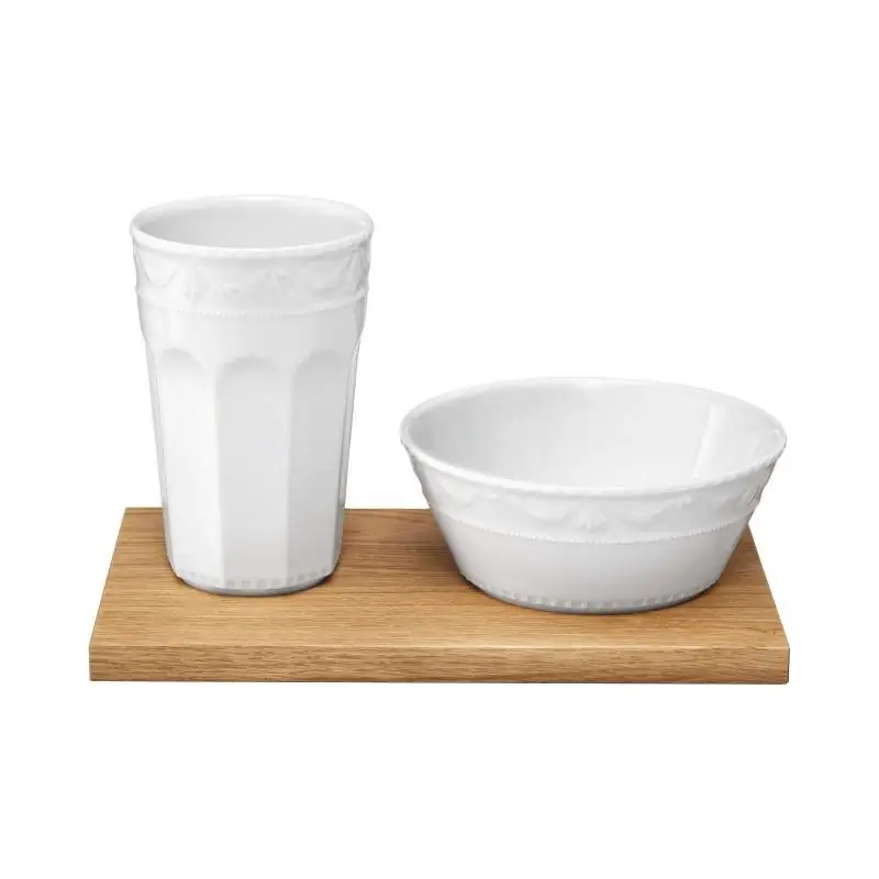 bestehend aus Müslischale, Macchiato-Becher und Holzbrett.