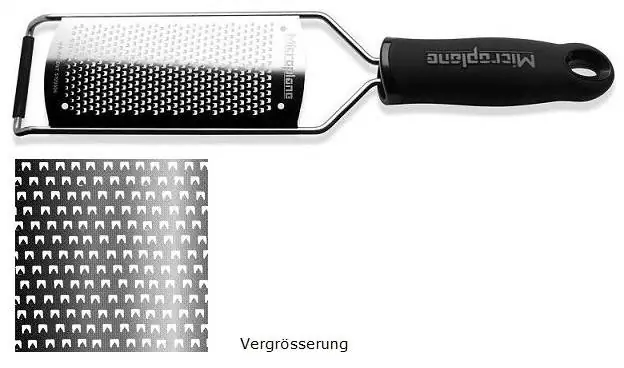 sehr fein, besonders geeignet für Muskatnüsse, Schokolade, aber auch Parmesan. Die hohe Schärfe erlaubt schnelles Arbeiten mit geringem Kraftaufwand.