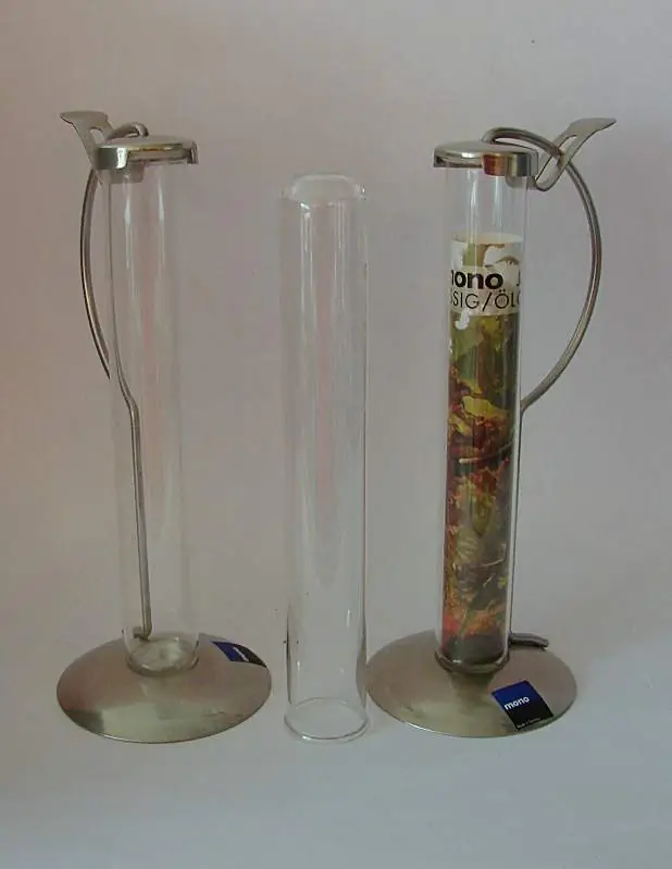 Reagenzglas-ähnliche Behälter für Essig und Öl. Gestelle aus Edelstahl.