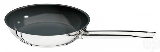 Relativ leichte Bratpfanne (1,45 kg) in Edelstahl mit hervorragender Keramikbeschichtung, PTFE - und PFOA - frei.