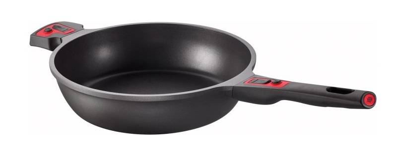 relativ leichte induktionsgeeignete Schmorpfanne mit abnehmbarem Griff.