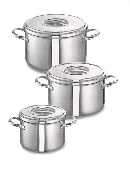 Hochwertiger rostfreier Edelstahl 18/10 in schwerer Ausführung, hochglanzpoliert. Profilgriffe ebenfalls aus rostfreiem Edelstahl 18/10, hitzeisolierend. Hochwertiger Zargendeckel aus rostfreiem Edelstahl 18/10 mit der zusätzlichen Möglichkeit, kaltes Wasser in die Deckelmulde zu geben für einen schnellen Kondensationseffekt im Topf. Deckel am Griff einhängbar, zur Lagerung stapelbar. Praktische Innenskalierung als Dosierhilfe, sicheres Abgießen durch stabilisierenden Schüttrand. Natürlich sind die Töpfe selbst auch Platz sparend stapelbar.