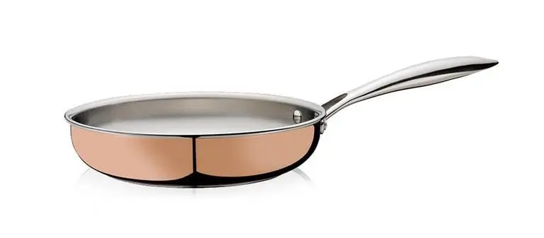 Bratpfanne aus fünfschichtigem Aufbau: auf der Innenseite Edelstahl, um die Gebrauchsfähigkeit zu gewährleisten. Im Kern drei Schichten Aluminium für hervorragende Hitzeverteilung, Außenseite aus Kupfer. Neben dem schönen Aussehen ist Kupfer natürlich auch ein excellenter Hitzeverteiler.