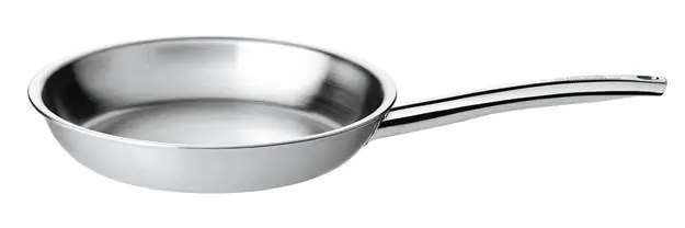 unbeschichtete Pfanne aus fünfschichtigem Mehrschichtmaterial, spülmaschinengeeignet, auch für Induktion.