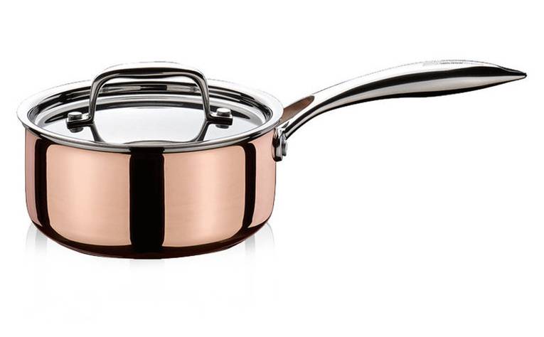 Das Culinox-Mehrschichtmaterial besteht aus fünf Schichten: innen Edelstahl, außen eine dünne Kupferschicht (poliert) und dazwischen drei Aluminium-Schichten für perfekte Hitzeverteilung auch bei Induktion.