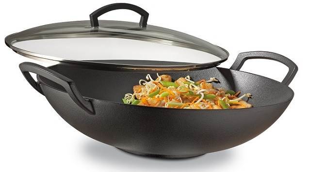 Wok aus hochwertigem Gusseisen für alle Herdarten, auch Induktion. Hervorragende Wärmespeicherung, kratzfeste Emaillierung. Set bestehend aus Wok 36 cm, Glasdeckel dazu, Abtropfgitter, Holzwender und Rezeptbuch.