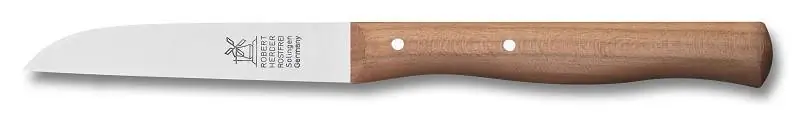 Fein gepließtete Klinge, rostfrei aus Chrom-Molybdän-Vanadium-Stahl. Klassische Klingenform. Ovaler Griff aus Kirschholz gedämpft.