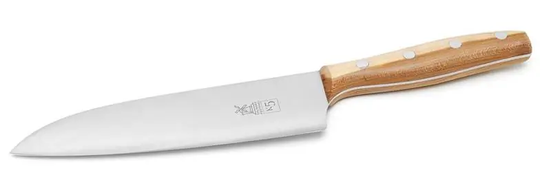 Stahl rostfrei aus Chrom-Molybdän-Vanadium-Stahl, Härtegrad 60° HRC. Klingenform nach Vorbild des japanischen Gyouto-Kochmessers.