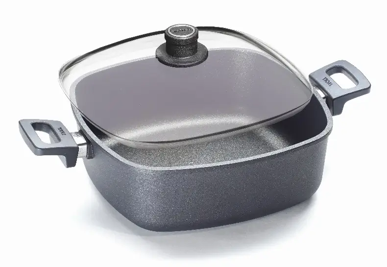 Bräter aus gegossenem Aluminium, 28 * 28 cm, Ø Boden 20 cm (Herdplatte), Höhe 10 cm. Für alle Herdarten, auch Induktion.