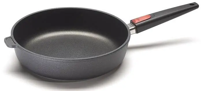 Hochrandpfanne aus gegossenem Aluminium, für alle Herdarten, auch Induktion. Griff abnehmbar bei Benutzung im Backofen.